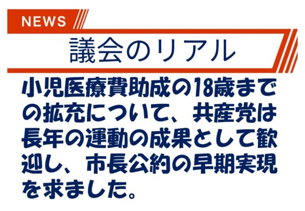 まず18歳の小児療費無料化助成の拡充について、市長選の直前で開かれた第2回定例会で出された請願、現在の15歳までのものを18歳まで拡充することについて、自民党も、公明党も、立憲民主党も、維新なども反対されました。