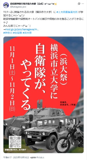 11月1~2日、横浜市立大学(公立大学法人)の大学祭が開催されます。そのイベントの一環として自衛隊が参加することが分かりました。
