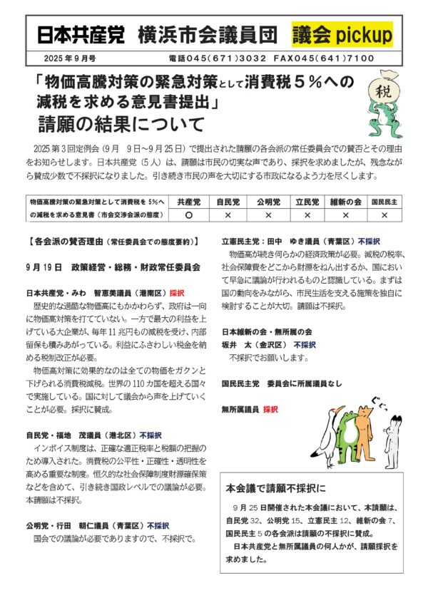 2025第3回定例会(9月 9日~9月25日)で提出された請願の各会派の常任委員会での賛否とその理由をお知らせします。日本共産党(5人)は、請願は市民の切実な声であり、採択を求めましたが、残念ながら賛成少数で不採択になりました。引き続き市民の声を大切にする市政になるよう力を尽くします。