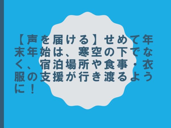 また、その後のフォローアップも大事です。年末年始の期間を終えた後も、生活保護が必要な方は申請の相談とか、ハローワークの就労相談など、引き続き行えるように、ぜひ調整を図っていただきたい。
