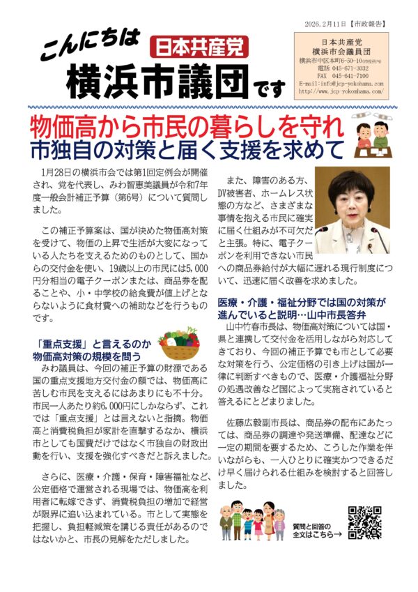 1月28日の横浜市会では第1回定例会が開催され、党を代表し、みわ智恵美議員が令和7年度一般会計補正予算(第6号)について質問しました。