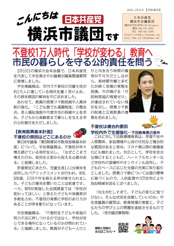 2月10日の横浜市会本会議で、日本共産党を代表して宇佐美さやか議員が議案関連質問に登壇しました。