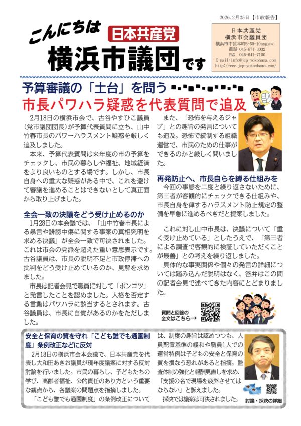 2月18日の横浜市会で、古谷やすひこ議員(党市議団団長)が予算代表質問に立ち、山中竹春市長のパワーハラスメント疑惑を厳しく追及しました。