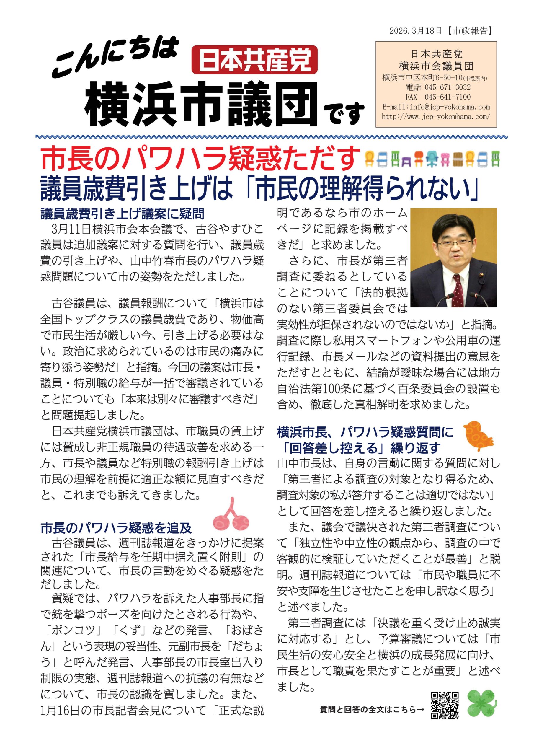 3月11日横浜市会本会議で、古谷やすひこ議員は追加議案に対する質問を行い、議員歳費の引き上げや、山中竹春市長のパワハラ疑惑問題について市の姿勢をただしました。