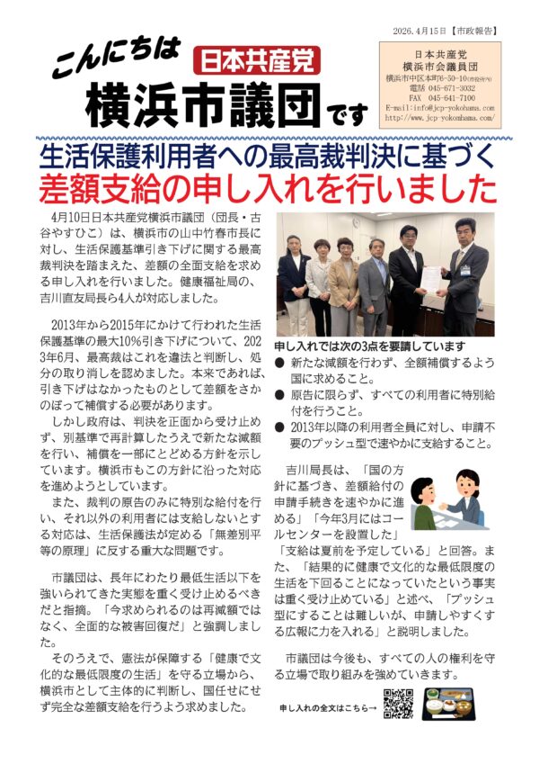 そのうえで、憲法が保障する「健康で文化的な最低限度の生活」を守る立場から、横浜市として主体的に判断し、国任せにせず完全な差額支給を行うよう求めました。