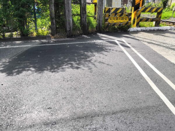 「近所の踏切の直前の舗装がボコボコの状態で、車輪付きの杖で母親が先頭に出かけたときに、舗装の陥没部分に車輪を取られ転倒した。車が並走していたらと思うとぞっとします。なんとかならないでしょうか?」とのメール。そして一緒に送られてきた写真が以下の通り。