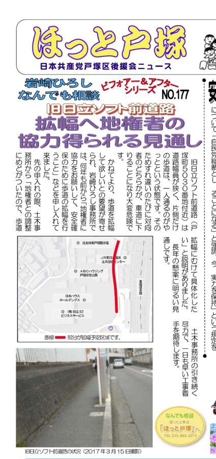 かねてより歩道を拡幅して欲しいとの要望が寄せられ、岩崎ひろし事務所では何年も前から「安全確保のために歩道の拡幅を行うこと」などを申し入れてきました。