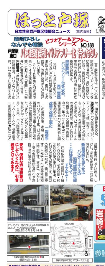 この答弁以後、市は、東口のバリアフリー化、バスの混雑緩和等の改善・改修を進める「戸塚駅周辺地区住み続けたいまち・みちづくり会議」を立ち上げ(2016年12月16日)、バス降車場からエレベーターへの「横断歩道一部再設置」など改善工事を行っています。しかし、深刻な状態は一向に解消されません。