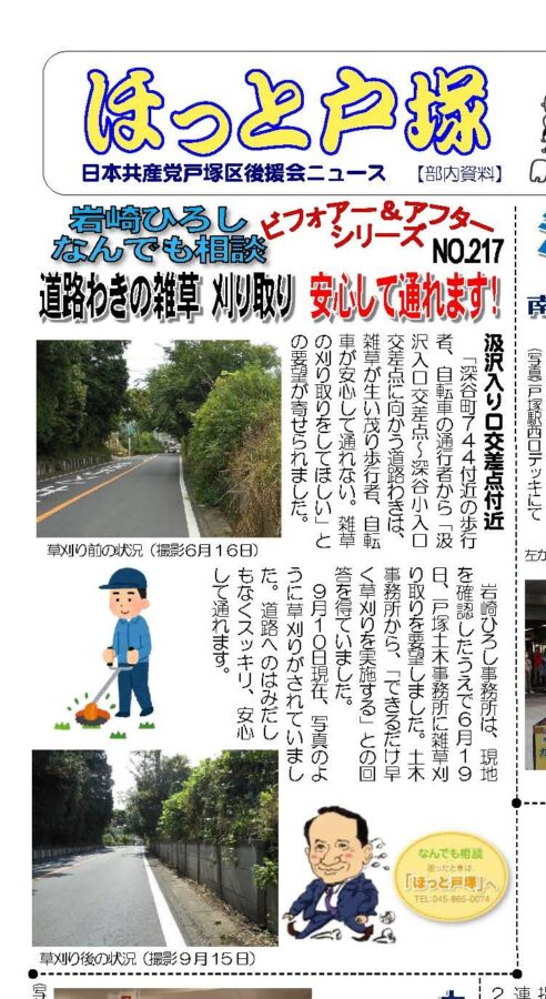 岩崎ひろし事務所は、現地を確認したうえで6月19日、戸塚土木事務所に雑草刈り取りを要望しました。土木事務所から、「できるだけ早く草刈りを実施する」との回答を得ていました。