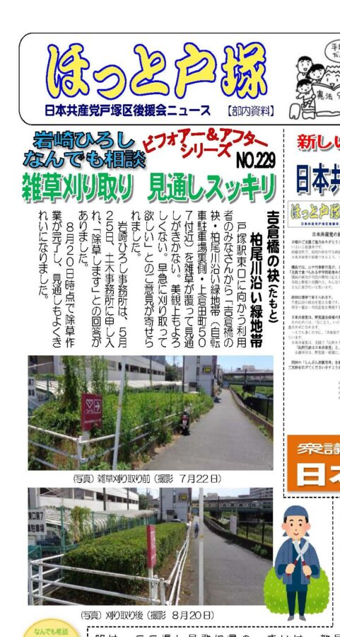 戸塚駅東口に向かう利用者のみなさんから「吉倉橋の袂・柏尾川沿い緑地帯(自転車駐車場裏側・上倉田町507付近)を雑草が覆って見通しがきかない。美観上もよろしくない。早急に刈り取って欲しい」とのご意見が寄せられました。