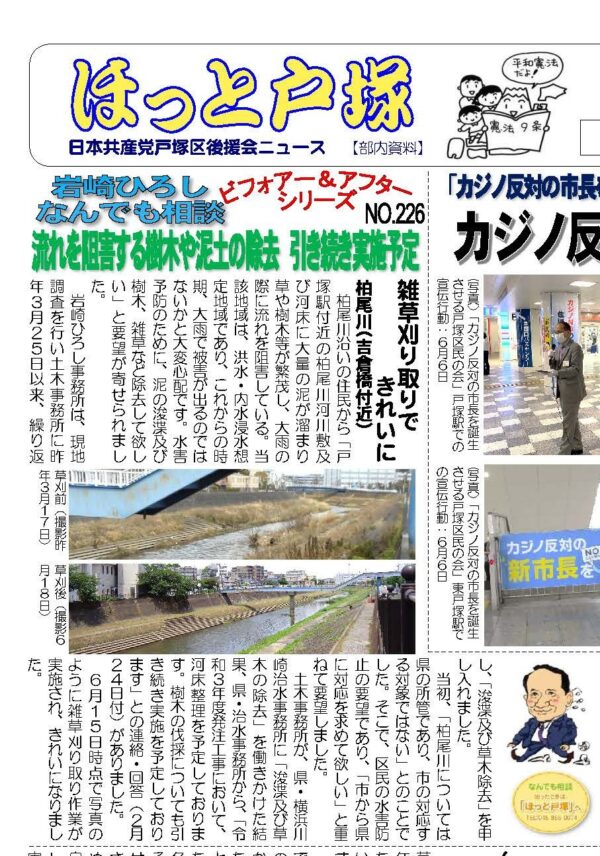 当初、「柏尾川については県の所管であり、市の対応する対象ではない」とのことでした。そこで、区民の水害防止の要望であり、「市から県に対応を求めて欲しい」と重ねて要望しました。