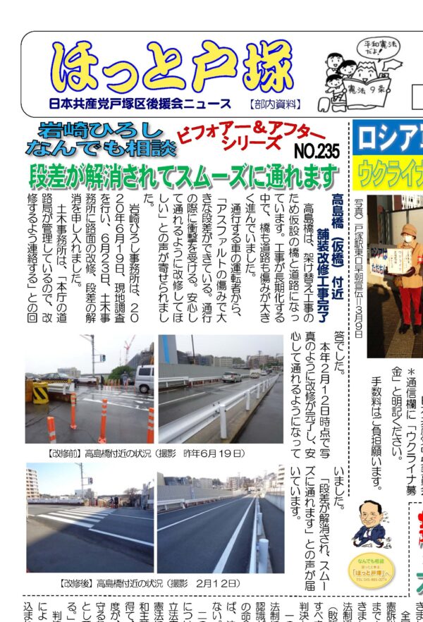 岩崎ひろし事務所は、2020年6月19日、現地調査を行い、6月23日、土木事務所に路面の改修、段差の解消を申し入れました。