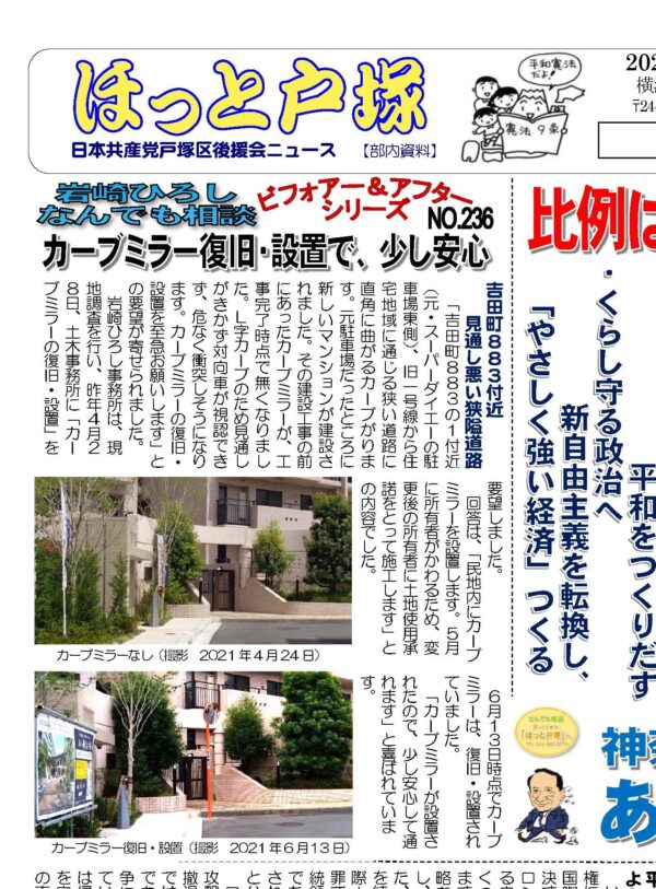 岩崎ひろし事務所は、現地調査を行い、昨年4月28日、土木事務所に「カーブミラーの復旧・設置」を要望しました。