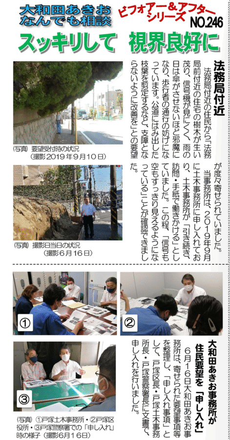 法務局付近の住民から「法務局前付近の住宅の樹木が生い茂り、信号機が見にくく、雨の日は傘がさせないほど邪魔になり、歩行者の通行の妨げになっています
