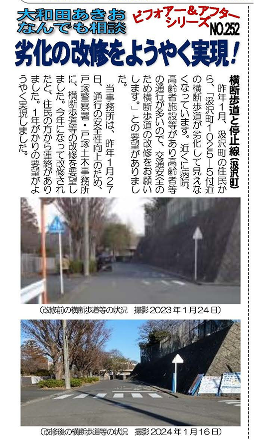 昨年1月、汲沢町の住民から、「汲沢町1025―5付近の横断歩道が劣化して見えなくなっています。近くに病院、高齢者施設等があり高齢者等の通行が多いので、交通安全のため横断歩道の改修をお願いします。」との要望がありました。