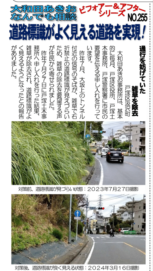 昨年7月27日に戸塚土木事務所へ申し入れを行った結果、雑草が除去され、道路標識がよく見えるようになったとの報告がありました。