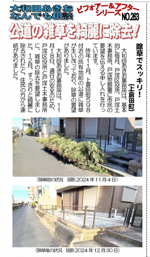 大和田あきお事務所は、11月18日、通行の安全のため、戸塚区役所と戸塚土木事務所に、雑草の除去を要望しました。12月、すっきりと綺麗に除去されたと、住民の方から連絡がありました。