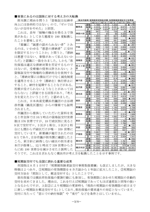 全国ワーストワンの資格証発行していた横浜市が大きな方針転換で、ほぼ資格証を発行しないように改善へ  ~「神奈川県社保協ニュース」2015年12月16日付 から