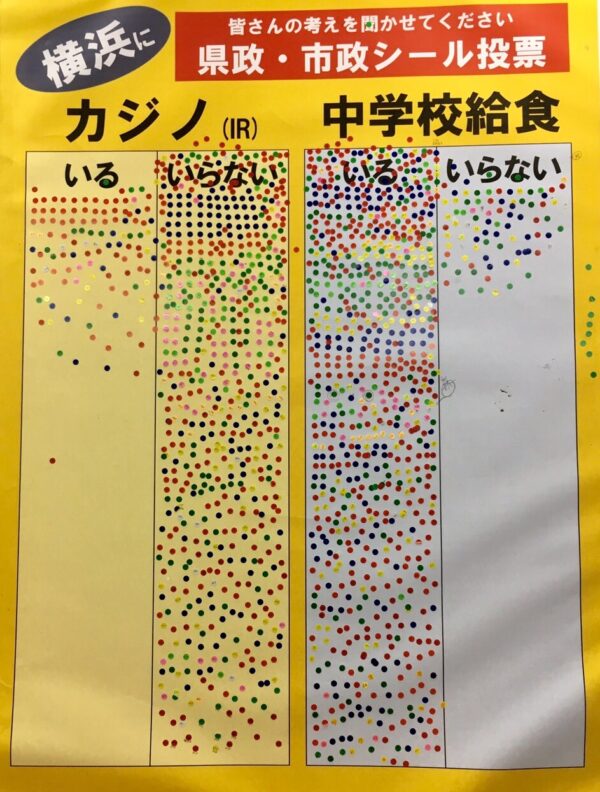 鶴見駅で昨年末から続けてきた「カジノ給食いる?いらない?」シールアンケートの結果です。