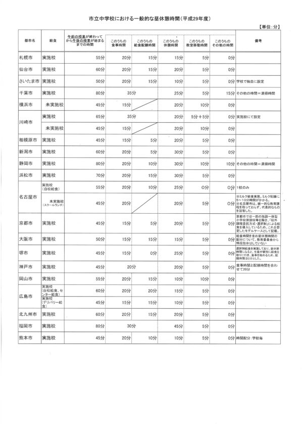 ではその状況が、全国的に見ればどうか?20の政令市の市立中学の昼休憩時間とその内訳を調べてもらいました(下表は横浜市会政策調査課調べ)。