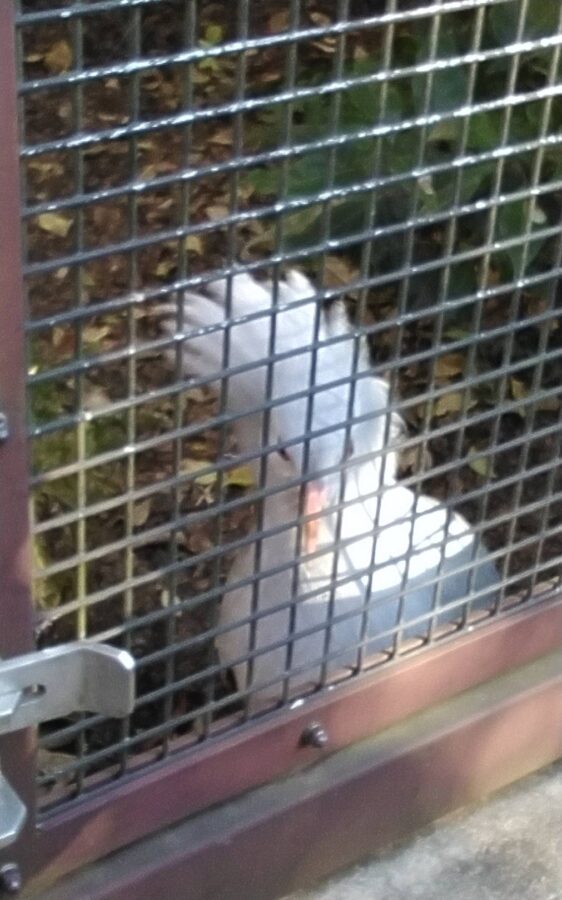 更に外の広いケージの前にきれいな鳥が見えた!何だっけな・・・?外国の鳩・・・。いかん思い出せない・・・。居た!カグ―!ニューカレドニアの飛べない鳥。1羽がこちらに来てくれて、頭の飾り羽立てて見せてくれた。そしてチーチーと鳴いて、お喋りしているみたい。聞く所によると、この個体は「人工飼育された子なので、人なっこいんですよ」と、可愛らしい子でした。
