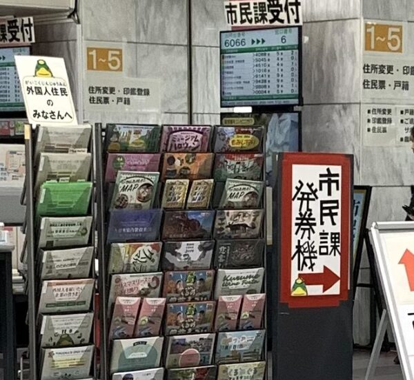 また、外国人住民のみなさんへと書かれた、多言語の案内パンフレットが多く配架されているコーナーが目に入る。